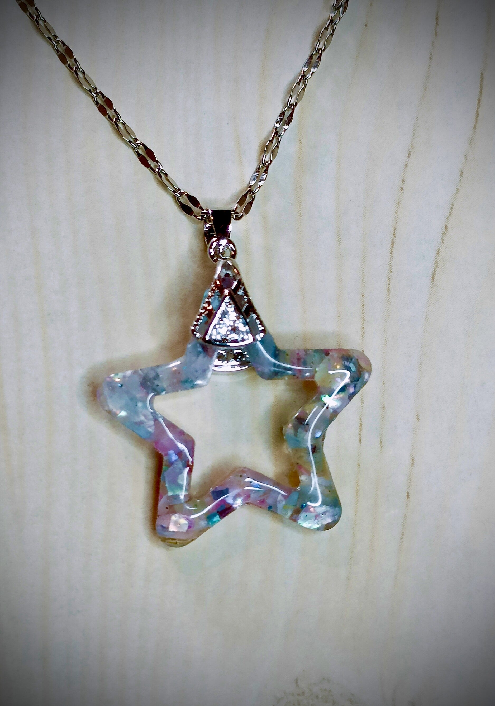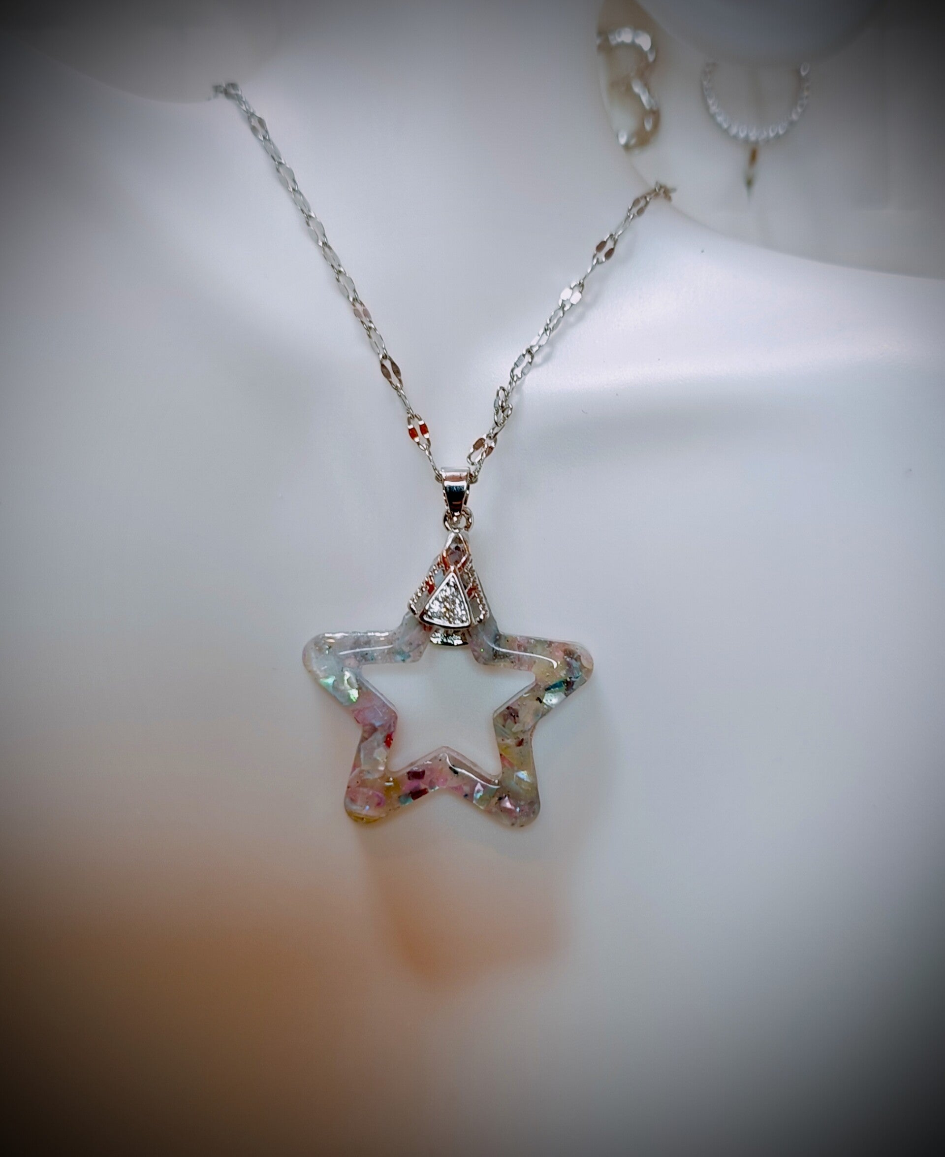 Pendentif étoile en résine et nacre multicolore chaîne en argent 925.