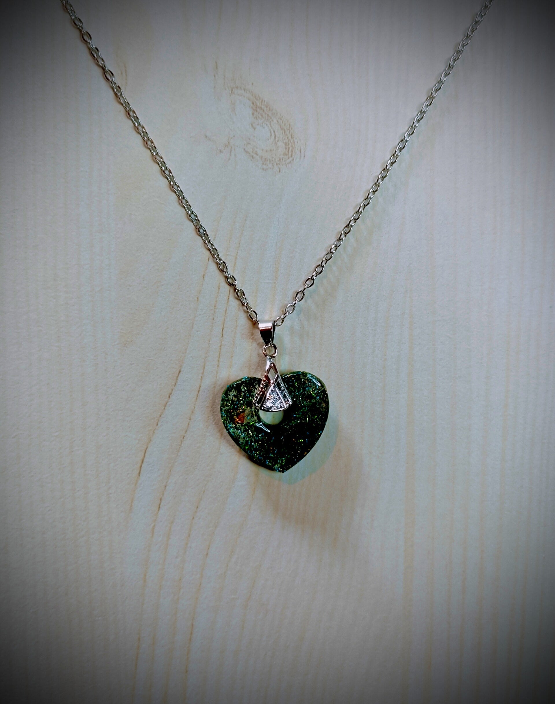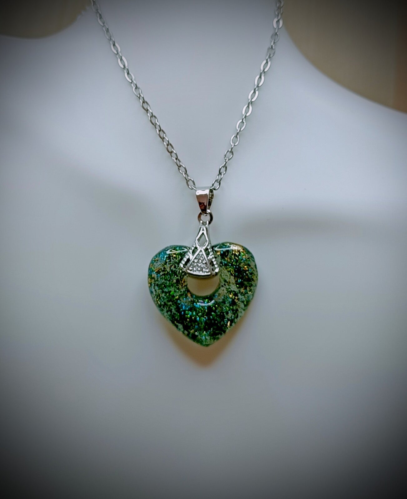 Pendentif coeur en résine et paillettes multicolore chaîne en argent 925.