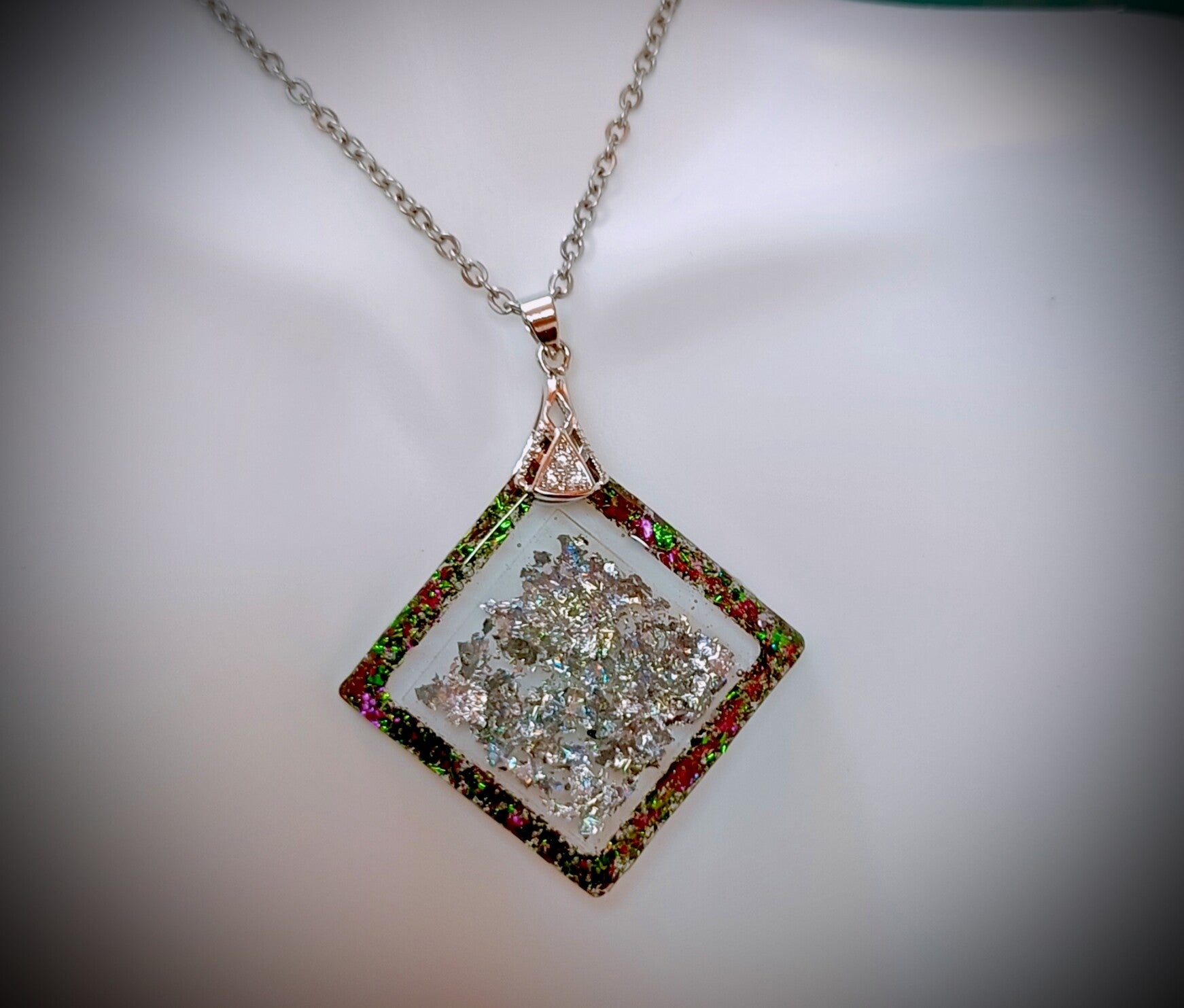 Pendentif en résine avec paillettes vert argenté avec chaîne 50 cm en argent 925 .