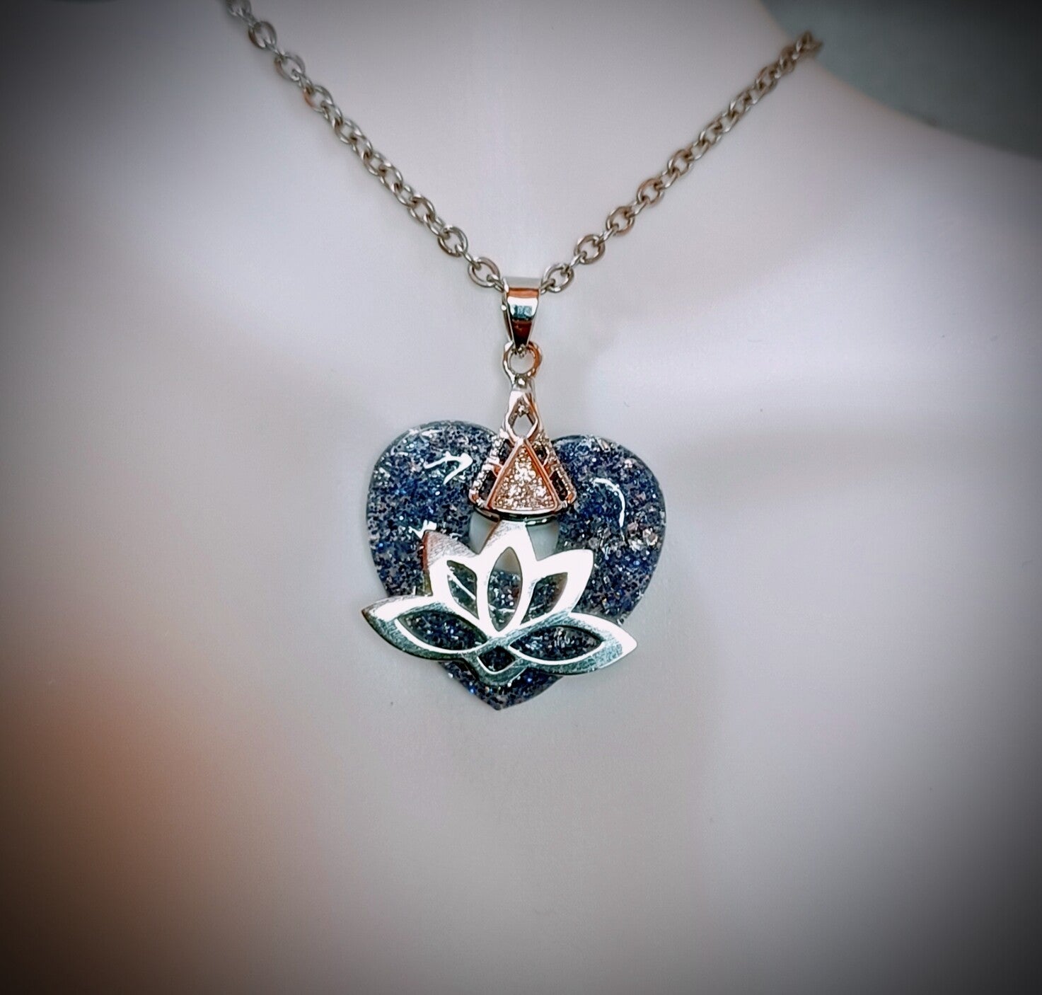 Pendentif en résine avec paillettes bleues et fleur de lotus.