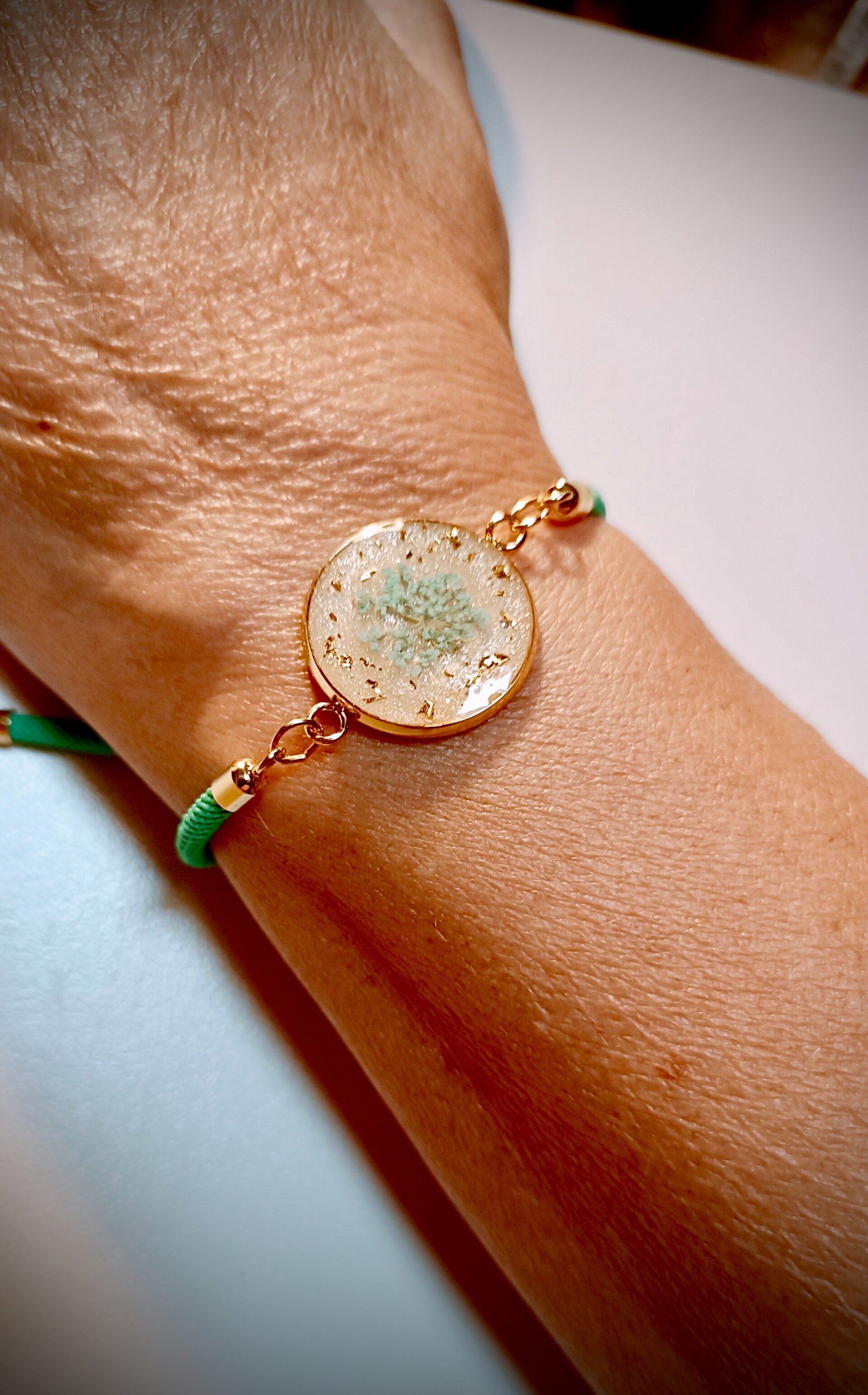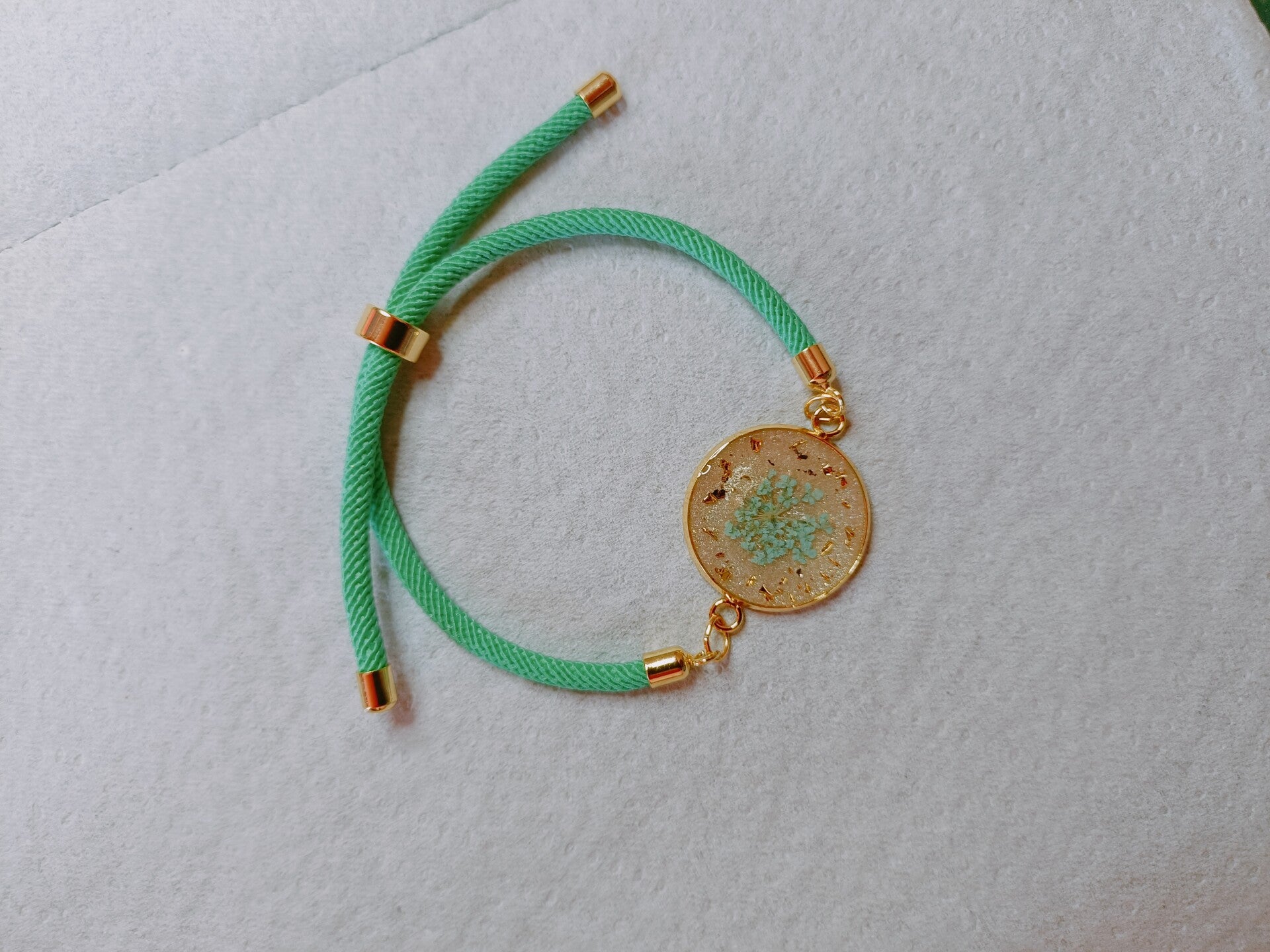 Bracelet en plaqué or 14 carats et résine avec petite fleur au milieu turquoise. Cordon en acrylique réglable.