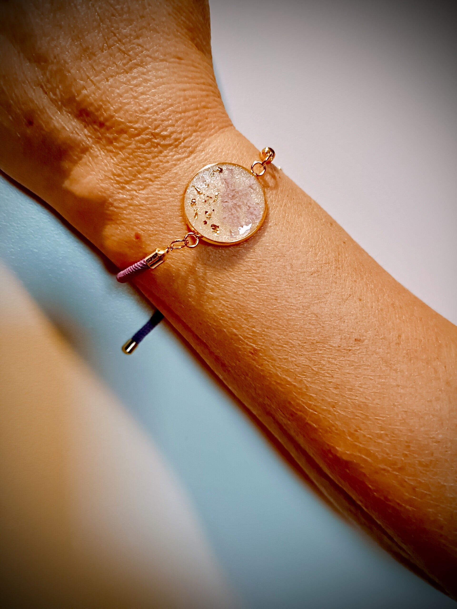 Bracelet en plaqué or 14 carats et résine avec petite fleur au blanche . Cordon en acrylique réglable beige.