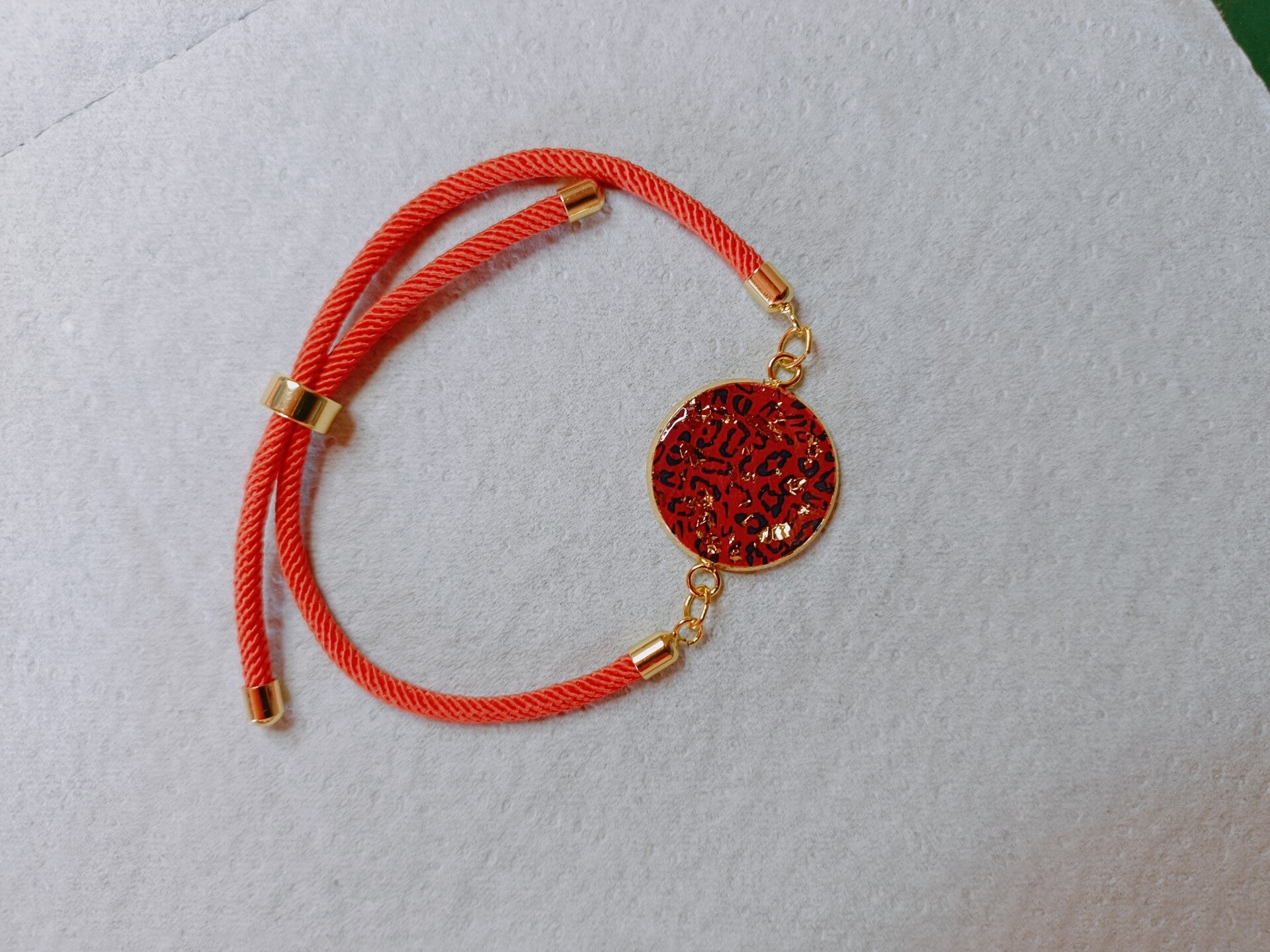 Bracelet en plaqué or 14 carats et résine avec petite fleur au milieu . Cordon en acrylique réglable orange.