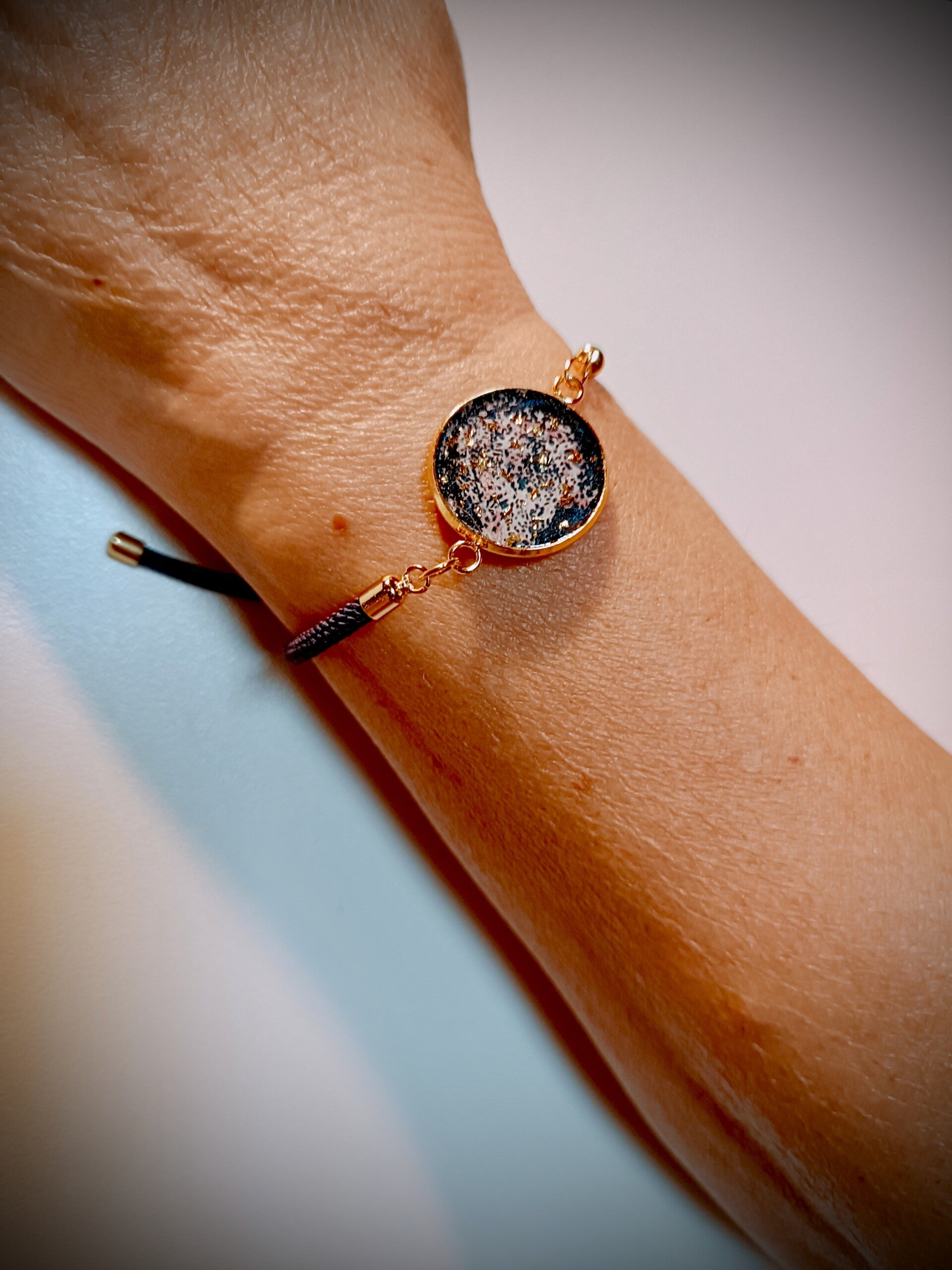 Bracelet en plaqué or 14 carats et résine avec petite fleur au milieu . Cordon en acrylique réglable bleu foncé.